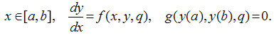 Здесь f (x, y, q) и g (y(a), y(b), q) - достаточно гладкие вектор-функции по совокупности аргументов, q – скалярный параметр, принадлежащий отрезку [qmin, qmax]. Предполагается, что в некоторой окрестности значения q = q0 краевая задача имеет решение y = y(t,q), дифференцируемое как по t, так и по параметру q.