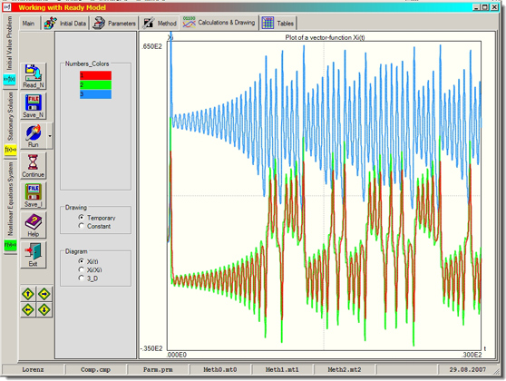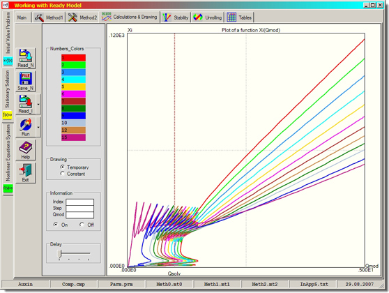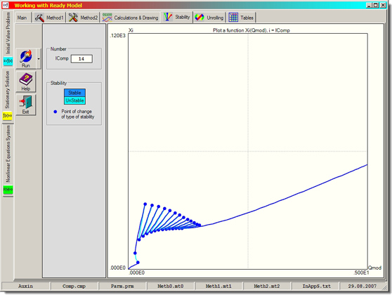 Диаграмма стационарного решения модели Auxin совместно с определением устойчивости Пакет состоит из четырех основных разделов: «Создание модели», «Задача Коши», «Стационарные решения» и «Нелинейные системы». Для осуществления запуска расчетных программ и задания расчетных параметров задачи с помощью пользовательского интерфейса создана программа для генерации DLL-библиотеки. Благодаря специальному виду задания правых частей системы дифференциальных уравнений, генератор также находит аналитически матрицу Якоби правых частей системы и матрицу производных по параметрам. Возможности пакета STEP+ демонстрируются на моделях: 'Auxin'[3], 'Kaskad'[4] , 'Lorenz'[4] и 'Grain'[5]. В отличие от первых трех моделей автономная система уравнений модели возникает в результате применения метода прямых к начально-краевой задаче для нелинейного уравнения параболического типа. Пакет STEP+ реализован в среде визуального программирования Visual Basic.NET и предназначен для использования в операционной системе WINDOWS 2000\XP. Литература: |